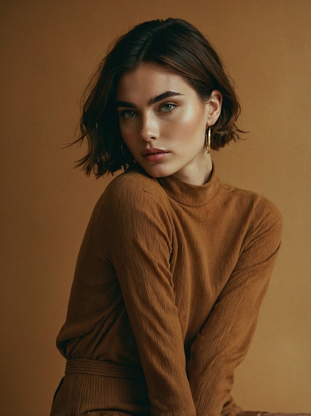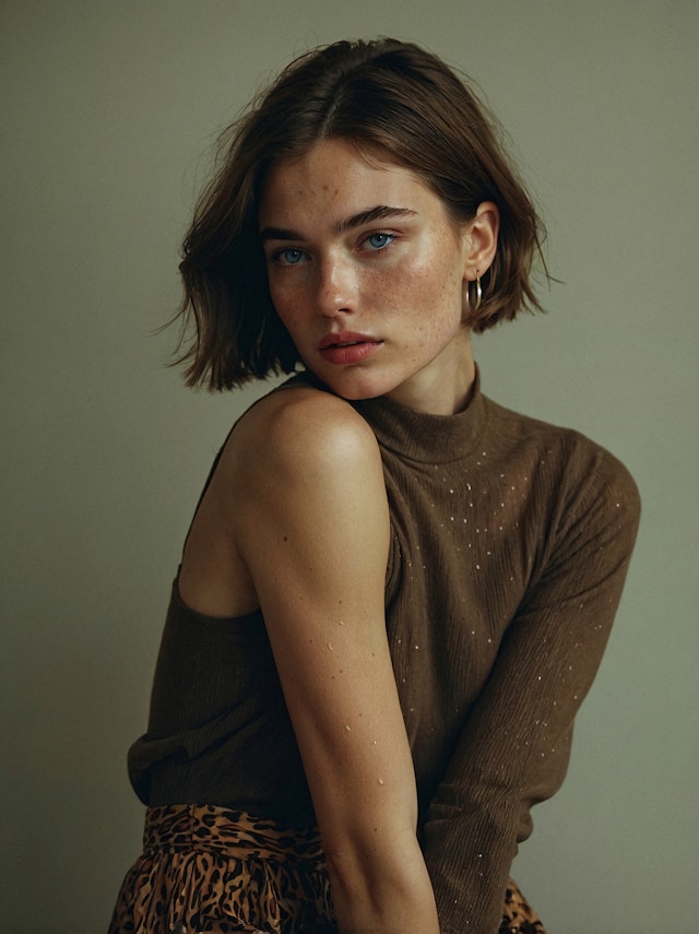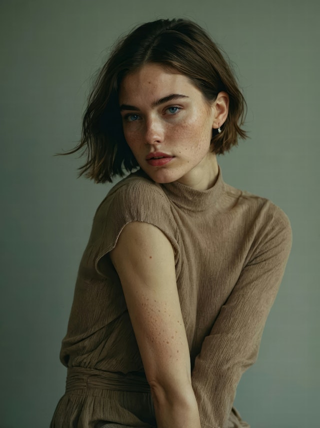 The collection features a young woman with short hair and striking, beautiful eyes. Her expression is calm and contemplative, with a slight tilt of the head adding a sense of introspection.