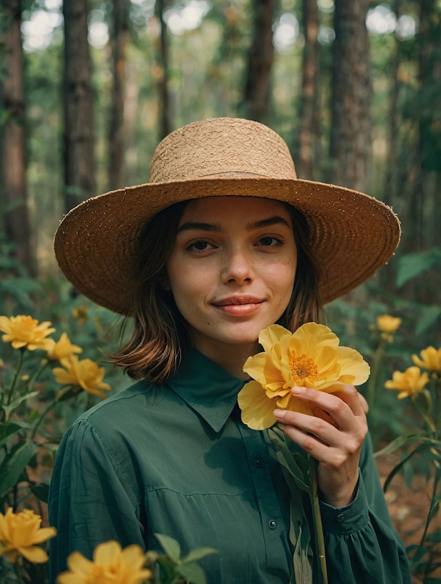 A collection of tranquil portraits celebrating the harmony between a woman and the vibrant beauty of yellow blooms, set against lush green landscapes.