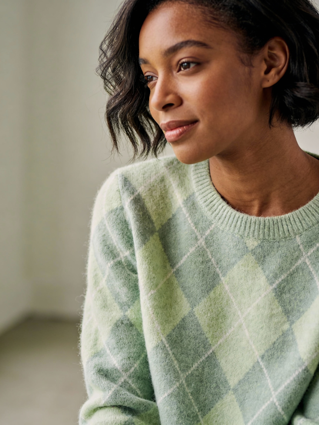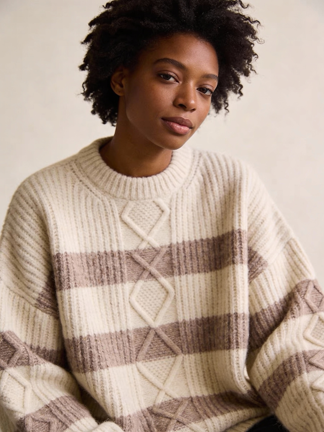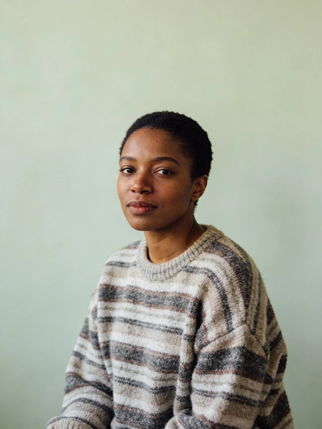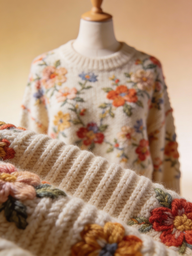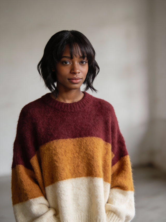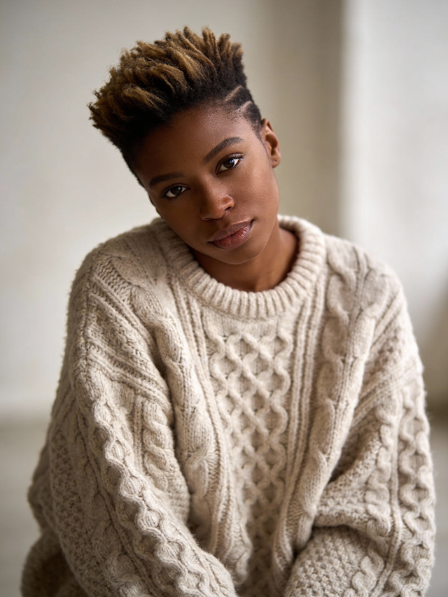 A calm, minimalist knitwear study highlighting soft textures, handcrafted details, and serene, confident portraiture. Ambient neutral lighting brings out every stitch, creating a warm, intimate mood.