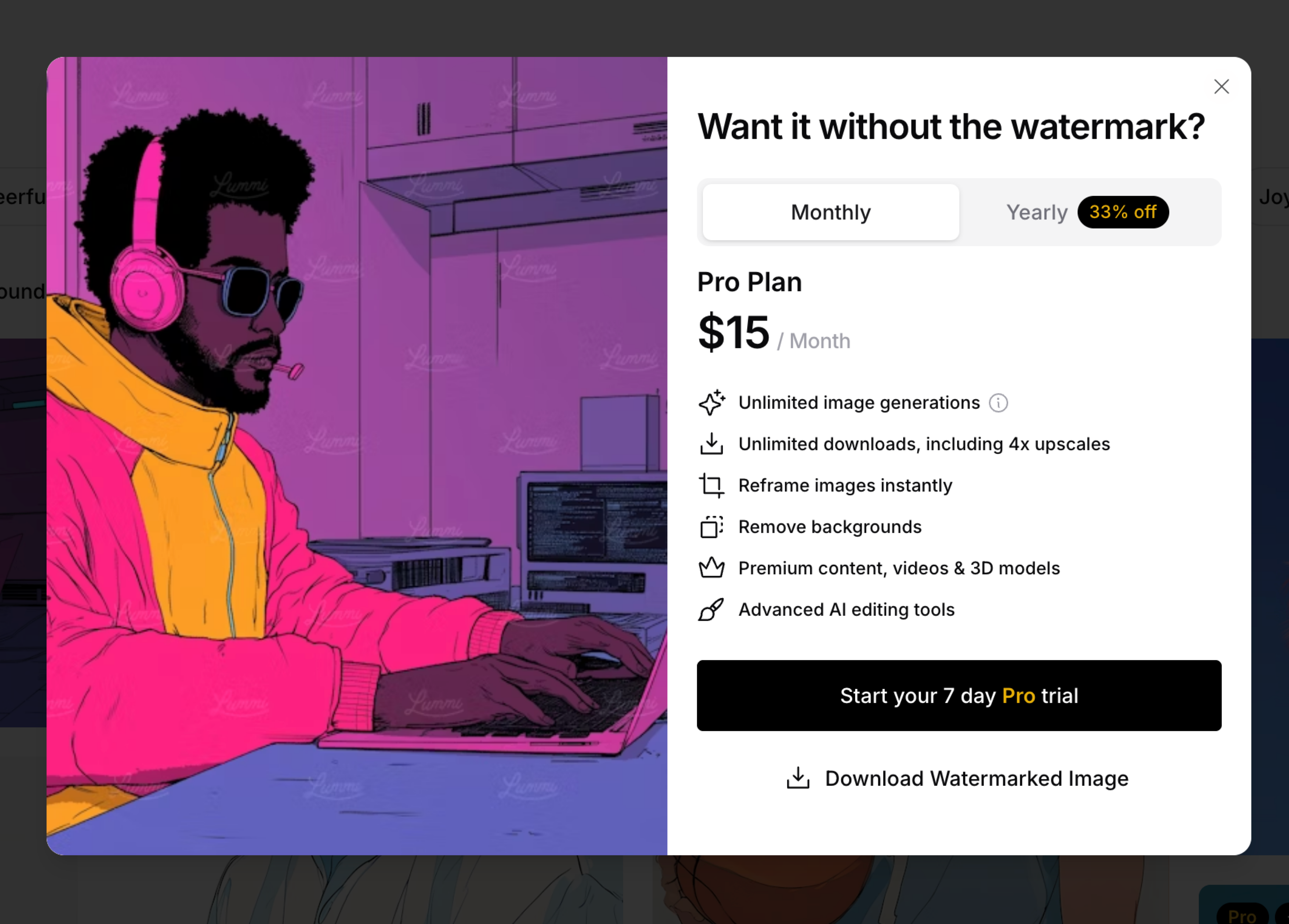 We’re introducing a 7-day free trial so you can explore Lummi Pro with no restrictions. That means faster generations, unlimited downloads, and full access to advanced tools like Reframe, Retouch, and Upscale. A credit card is required to start the trial, but you can cancel anytime before it ends.