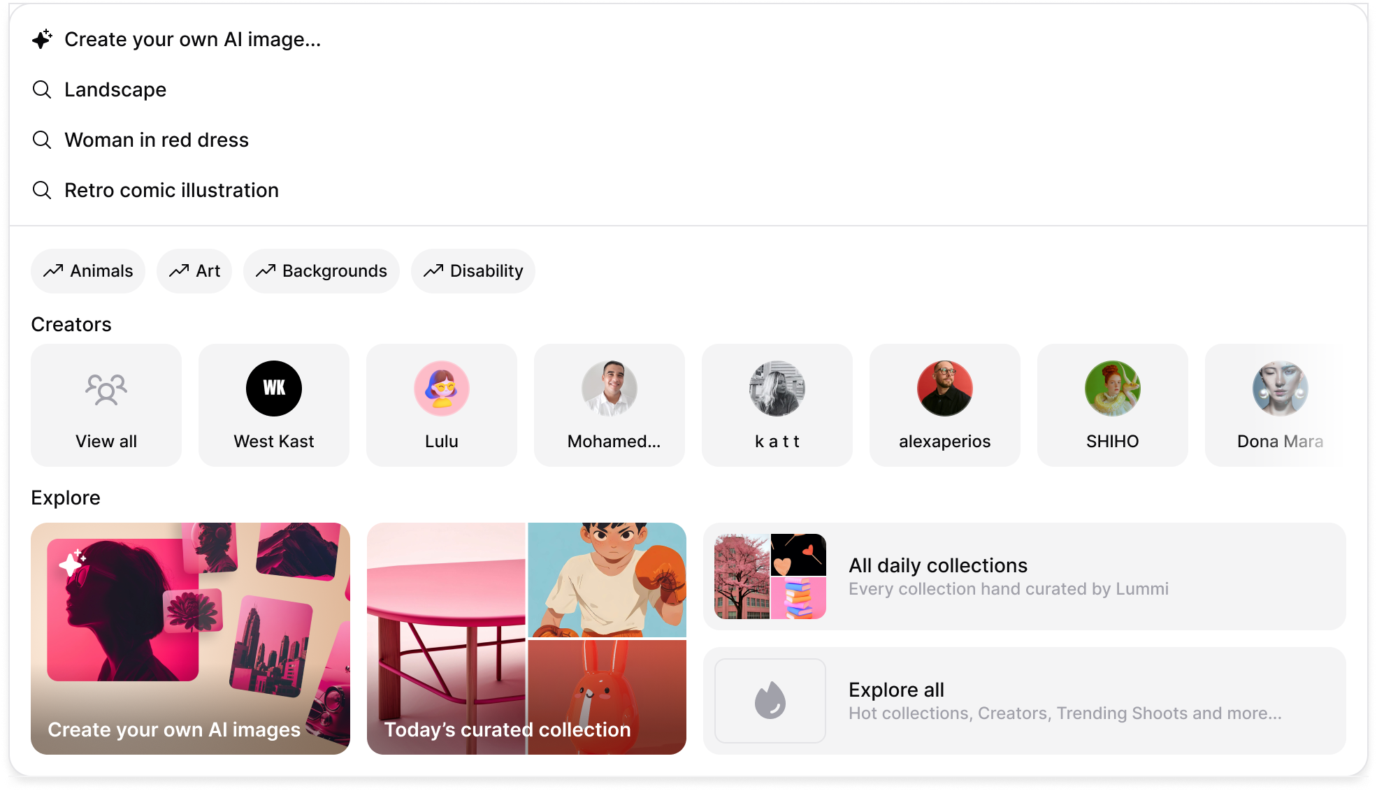 Try it nowWe updated the search bar to make it easier to start creating from scratch. You’ll now see “Create your own image” right at the top of the suggestions, followed by your recent searches.