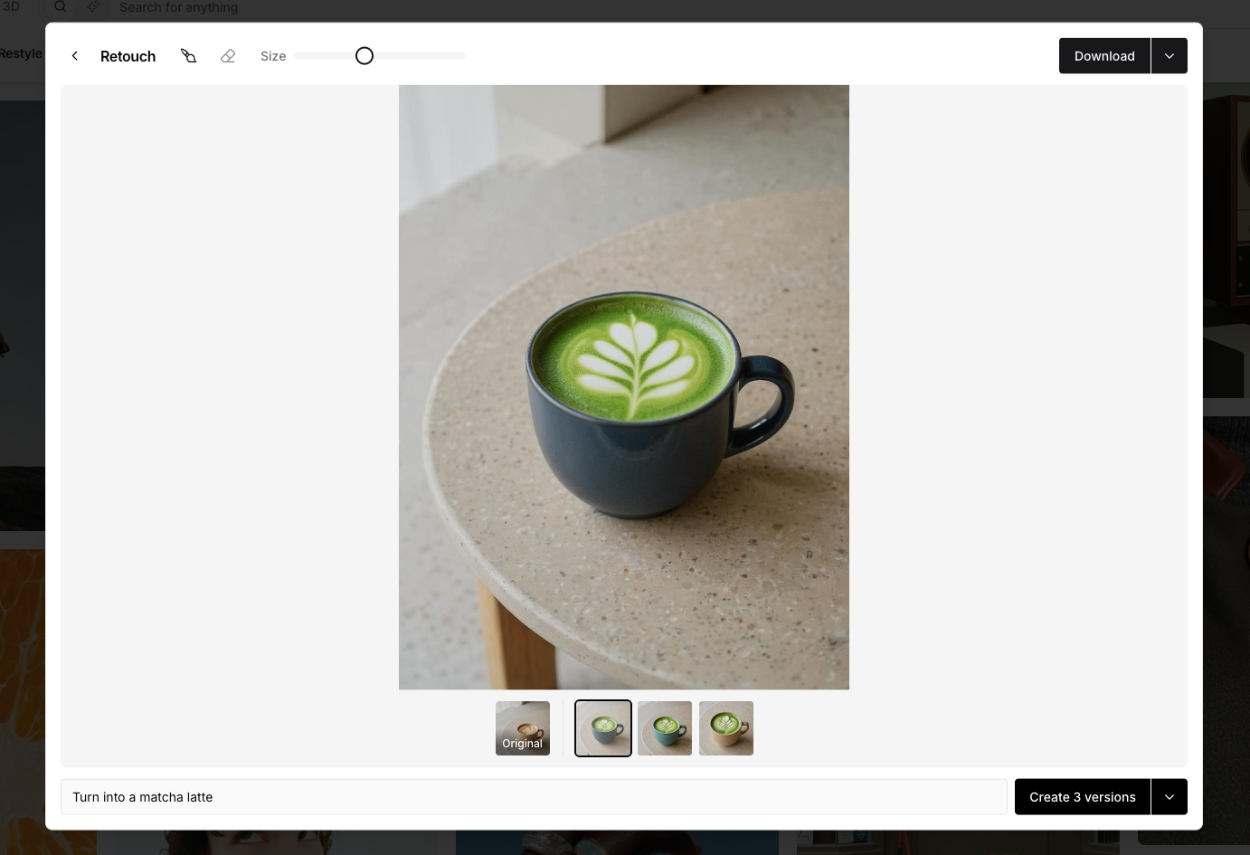 Retouch now uses our new Flux Kontext model, so you don’t need to brush over areas for it to work. Just type your prompt and hit Retouch and see the image transform automatically. You can still use the brush if you want more control—especially when isolating an object or refining the result.